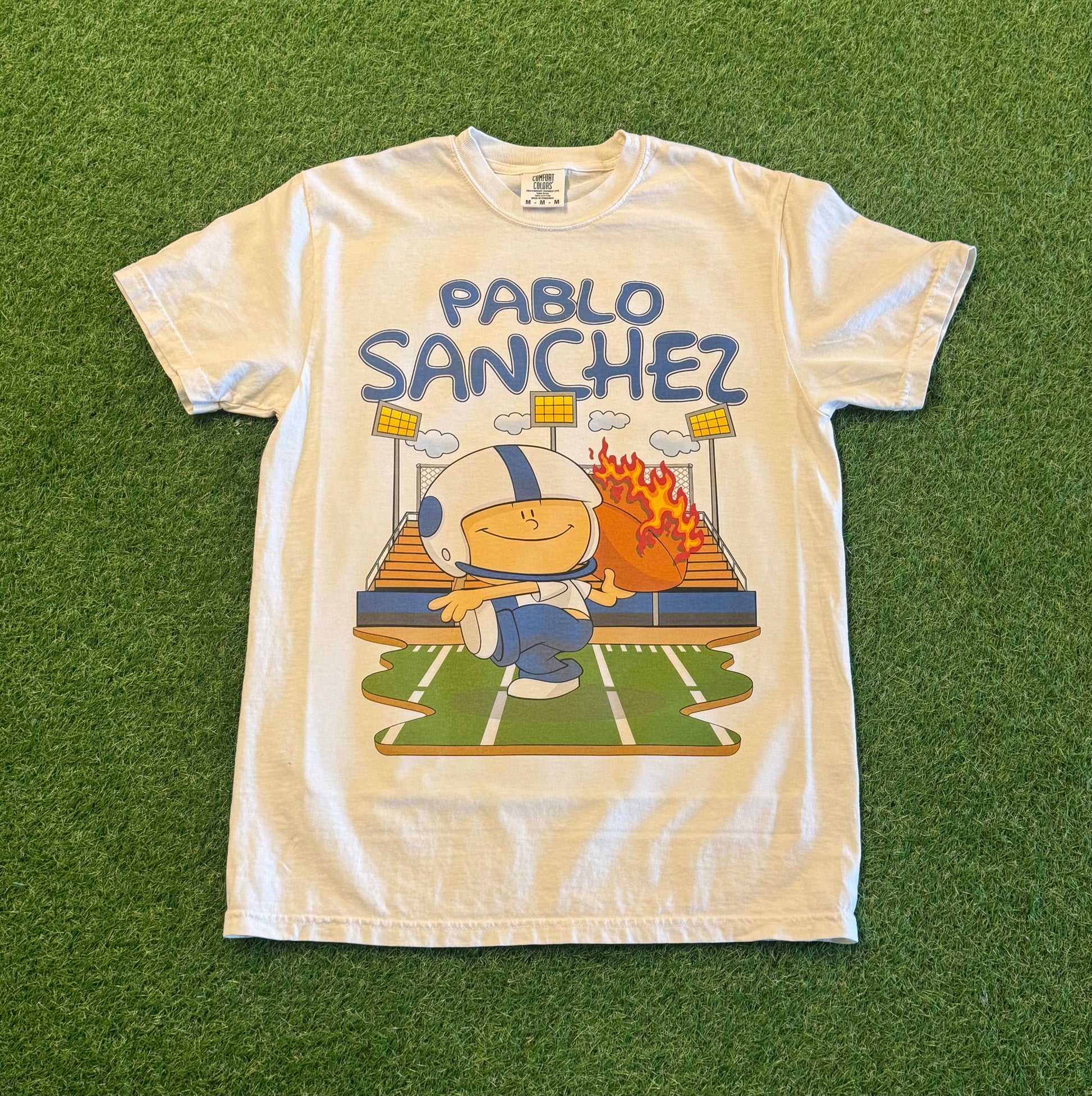 This t-shirt is designed by Planet Euphoria and features fan-favorite Secret Weapon, Pablo Sanchez at Quarterback. The nostalgic art style captures a classic backyard baseball field scene. Bold, playful text spells out “Pablo Sanchez” above the character, making it a perfect tribute for fans of the iconic game series.