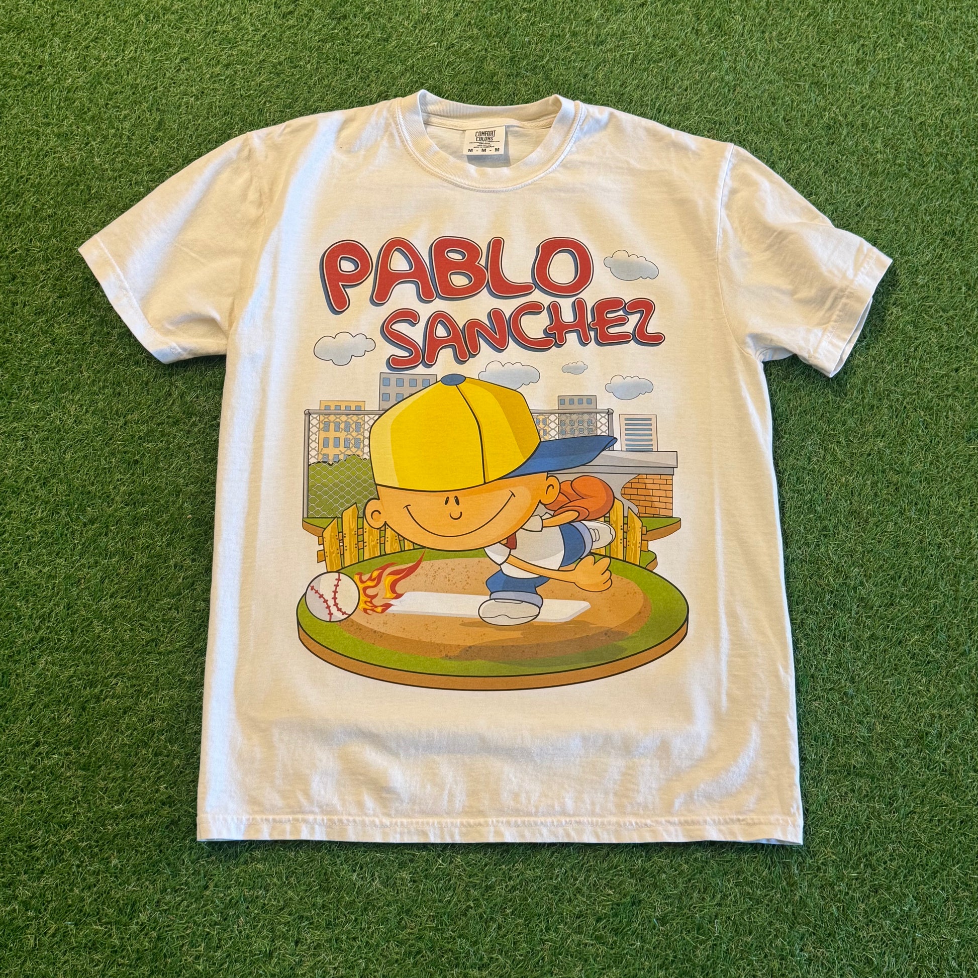 This t-shirt is designed by Planet Euphoria and features fan-favorite Secret Weapon, Pablo Sanchez at Pitcher. The nostalgic art style captures a classic backyard baseball field scene. Bold, playful text spells out “Pablo Sanchez” above the character, making it a perfect tribute for fans of the iconic game series.